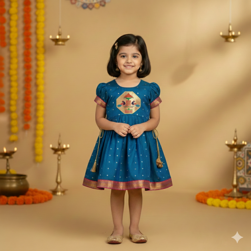 Dual-Tone Blue Silk Frock with Paithani Peacock Patch for Girls