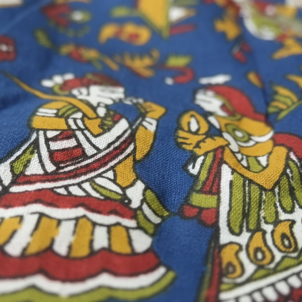 This beautiful Kalamkari cotton frock is designed to bring together comfort, culture, and playful elegance for young girls. Crafted from soft, breathable cotton, the frock features classic Kalamkari-style prints inspired by Indian folk art. The bodice showcases a rich contrast print, while the flared skirt is adorned with detailed traditional motifs that add visual charm.