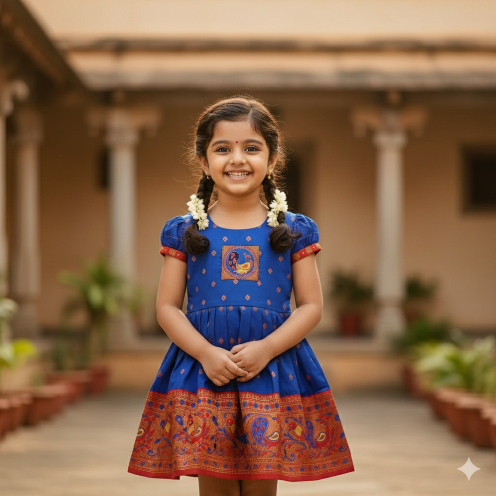 Introduce your little one to the beauty of traditional attire with our Paithani Frock. Shop now and let your child twirl in style!
