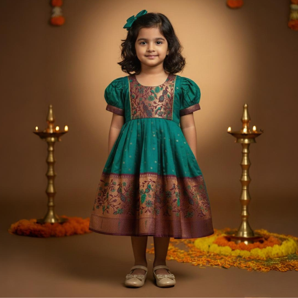 Kids Ethnic Wear, Girls Traditional Frock, Semi Silk Frock for Girls, Peacock Brocade Dress, Paithani Inspired Kids Dress, Festive Wear for Girls, Indian Ethnic Kids Clothing, KanyaKala Girls Collection, Wedding Wear Frock for Kids
