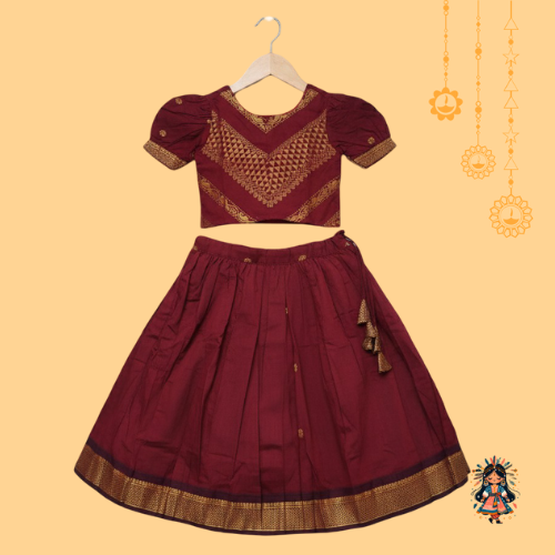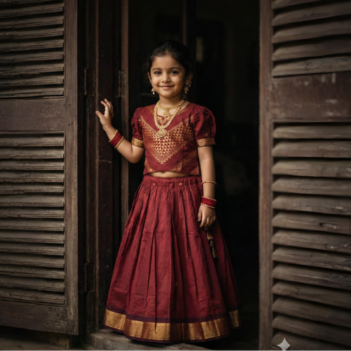 Sleeves: Matching maroon puff sleeves with a thick zari border at the hem, adding a cute, vintage charm.