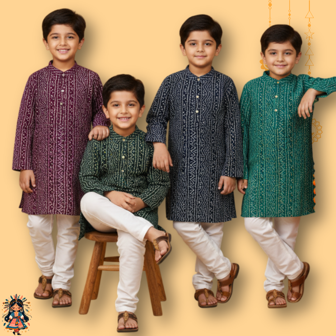 Dress your little prince in timeless tradition! This elegant green printed kurta pajama set from KanyaKala blends cultural charm with modern comfort perfect for festive occasions, family functions, and celebrations.