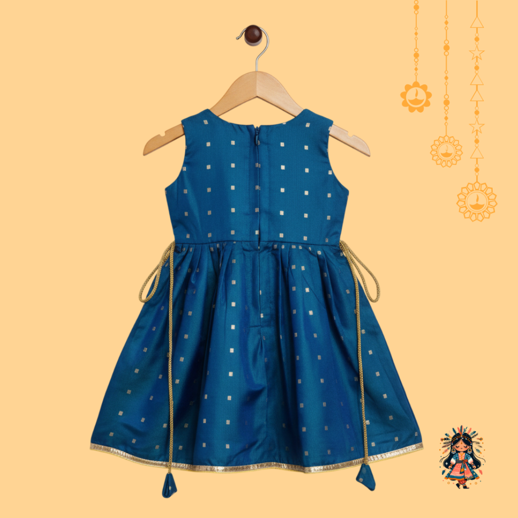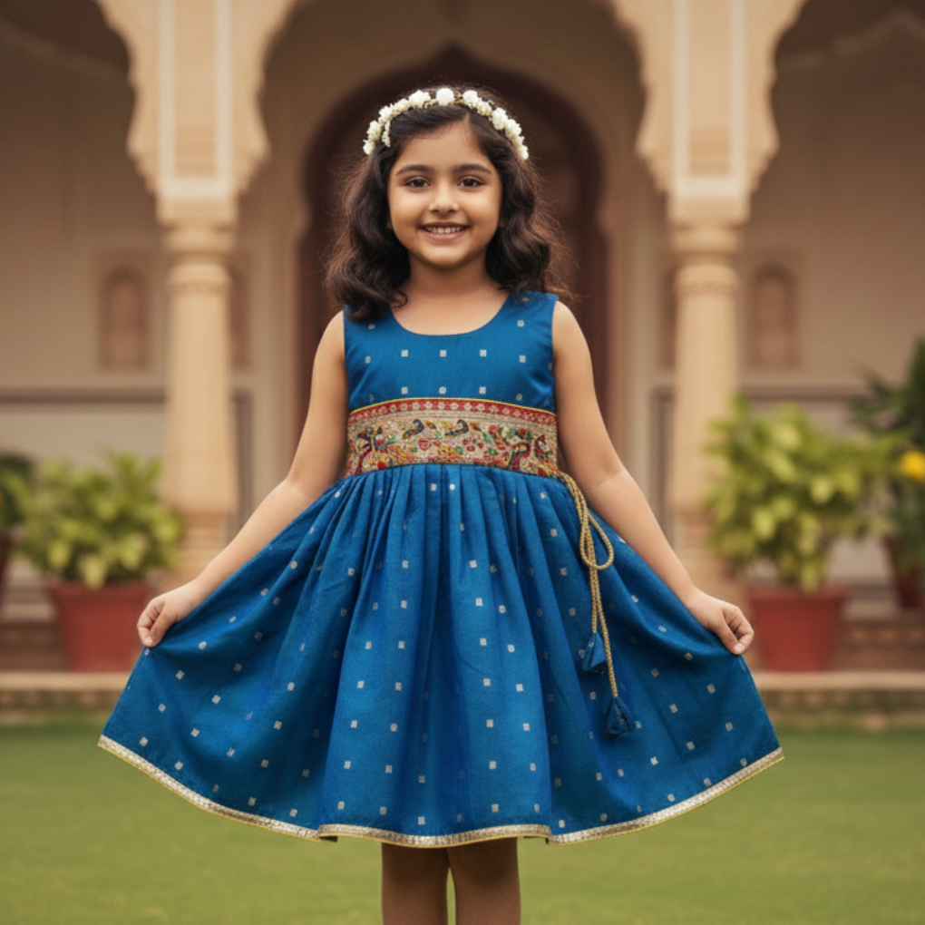 KanyaKala’s Premium Dual Tone Silk Frock with Paithani Peacock Lace | Sleeveless | Blue | Traditional Indian Wear for Girls