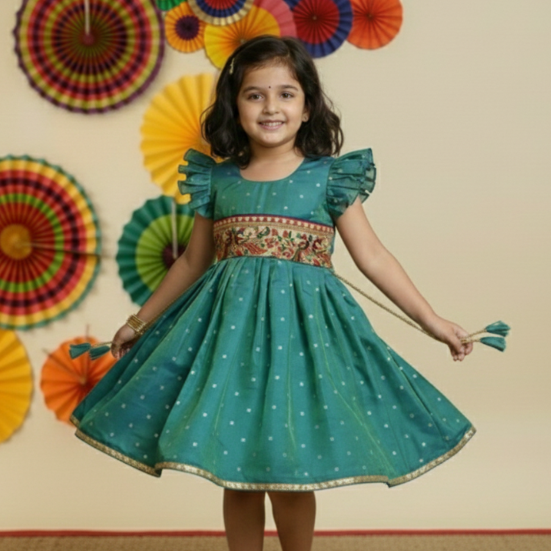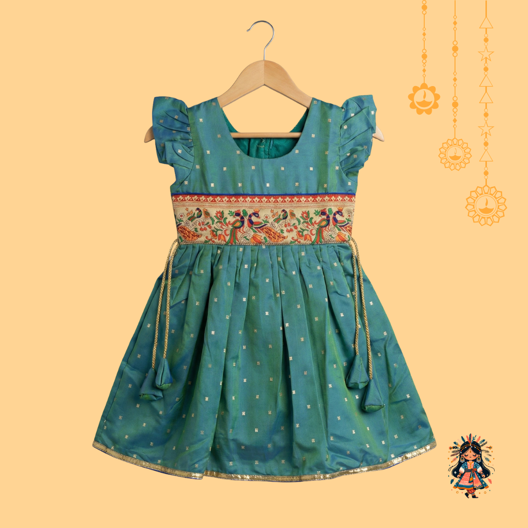 teal green kids frock | peacock border frock | KanyaKala traditional frock | silk blend frock for girls | Indian ethnic wear for kids | ruffle sleeve frock | girls festive dress | zari work frock | baby girl traditional dress | kids ethnic frock online