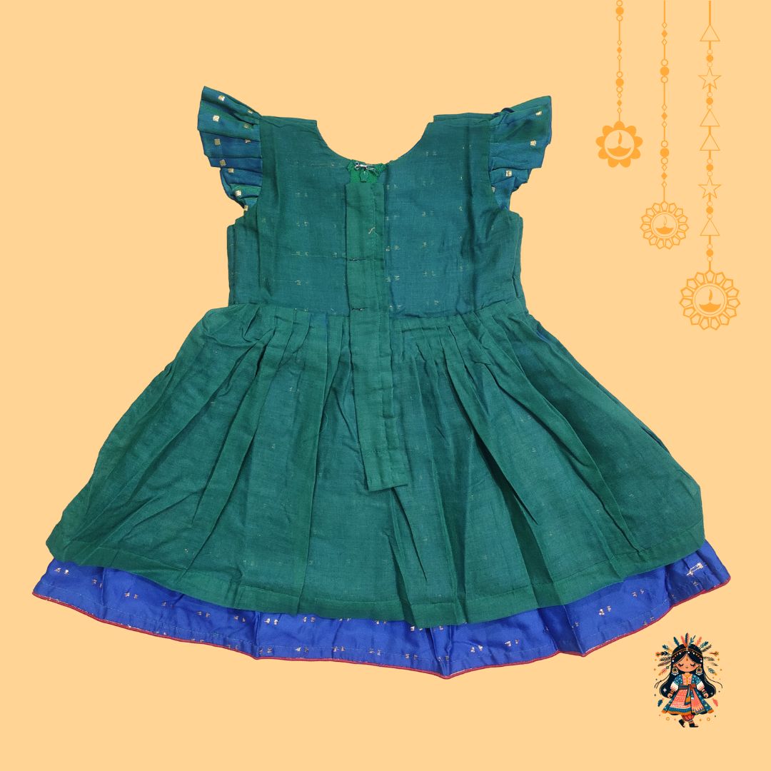 Teal Green with Blueish kids frock | peacock border frock | KanyaKala traditional frock | silk blend frock for girls | Indian ethnic wear for kids | ruffle sleeve frock | girls festive dress | zari work frock | baby girl traditional dress | kids ethnic frock online