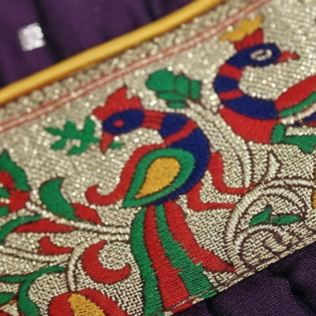 | Work / Pattern | Peacock embroidered waist border + zari dots |