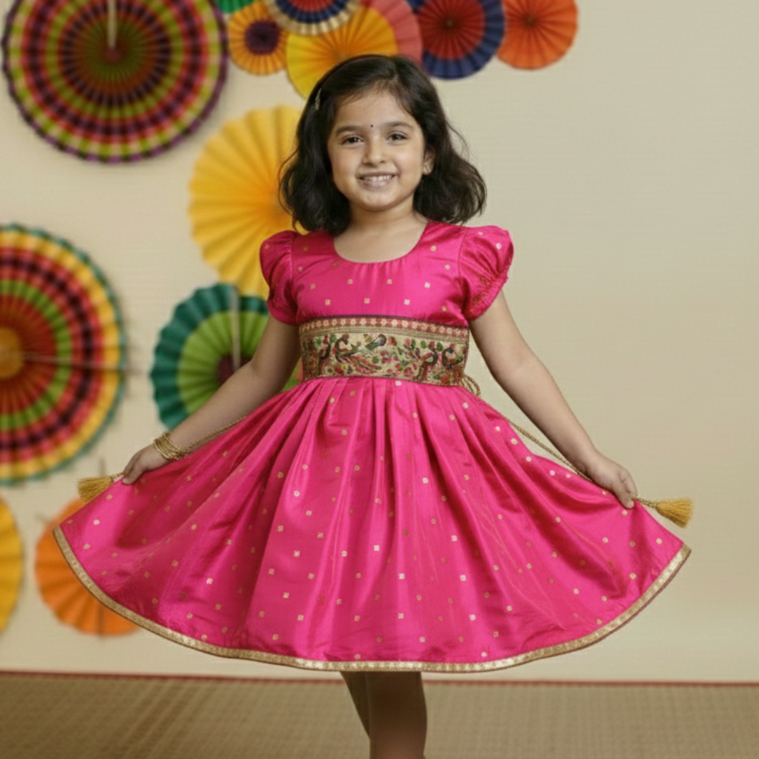 rani pink kids frock | peacock border frock | KanyaKala traditional frock | silk blend frock for girls | Indian ethnic wear for kids | ruffle sleeve frock | girls festive dress | zari work frock | baby girl traditional dress | kids ethnic frock online