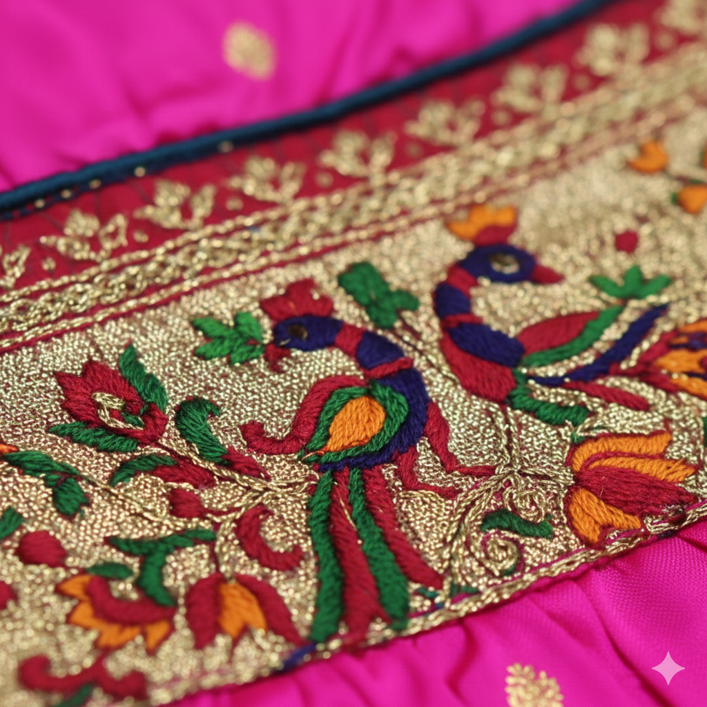 | Work / Pattern | Peacock embroidered waist border + zari dots |