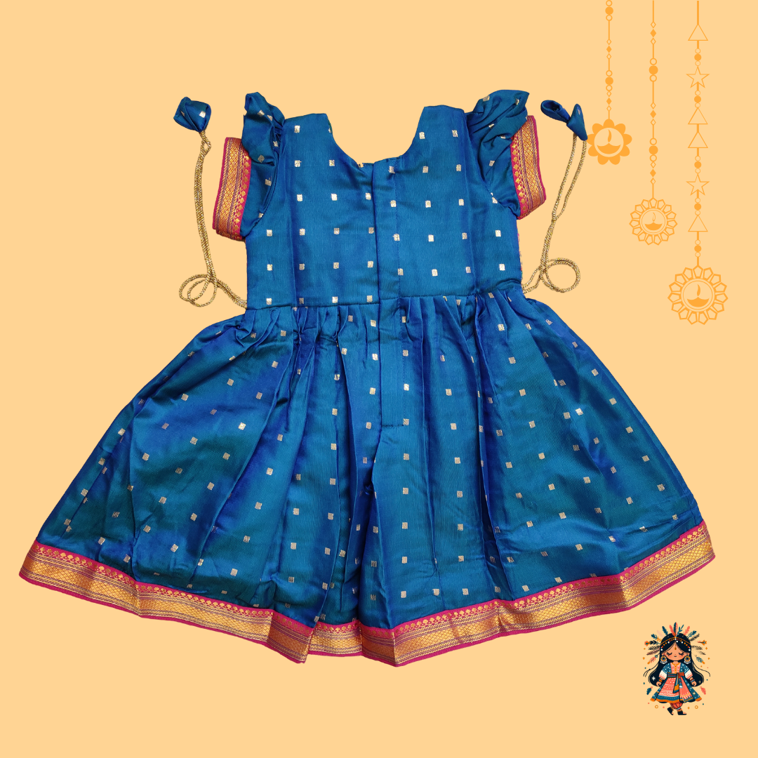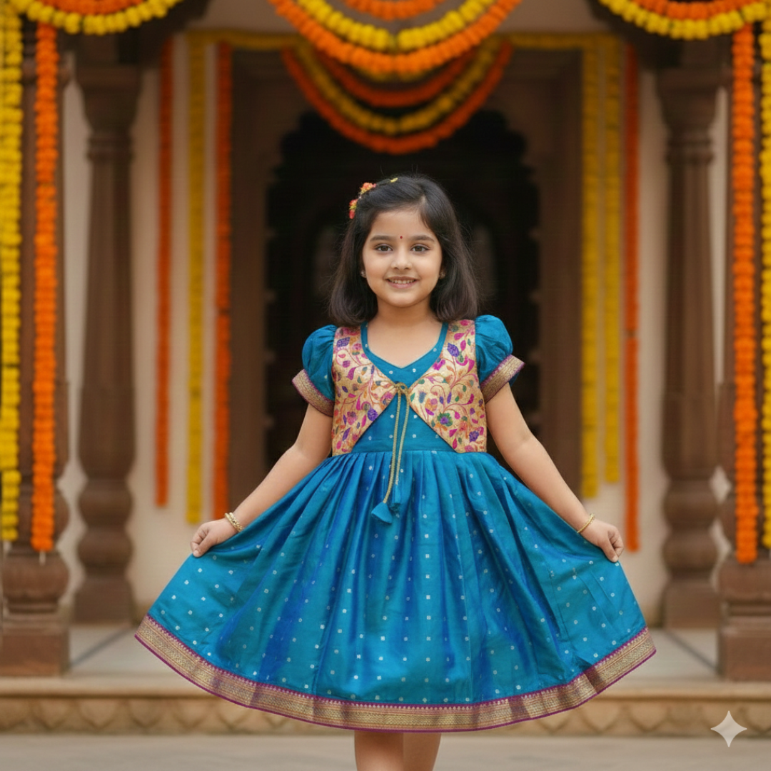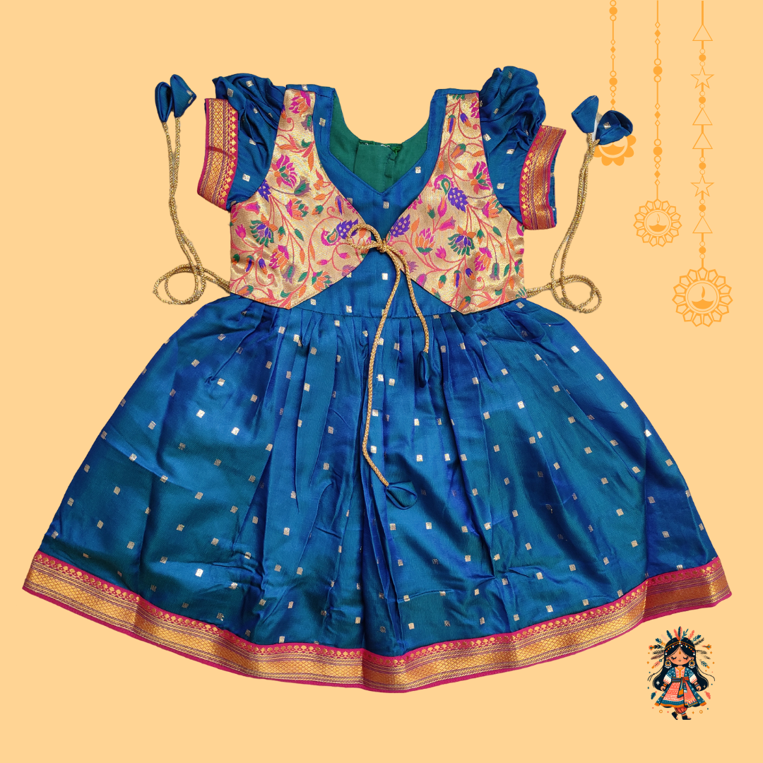 Introducing our exclusive Dual Tone Silk frock, a perfect blend of tradition and elegance designed for your little princess. This stunning piece is crafted from premium Taffeta Silk fabric, renowned for its rich texture and vibrant hues. The attached Paithani peacock brocade jacket adds a touch of opulence, featuring intricate peacock motifs symbolising grace and beauty. Ideal for festive occasions, weddings, and cultural events, this frock celebrates the timeless artistry of Indian craftsmanship while keeping your child comfortable and stylish. Embrace the essence of Indian heritage with this exquisite ensemble. Crafted with utmost care, it ensures unparalleled comfort with its soft cotton lining, perfect for your little princess.