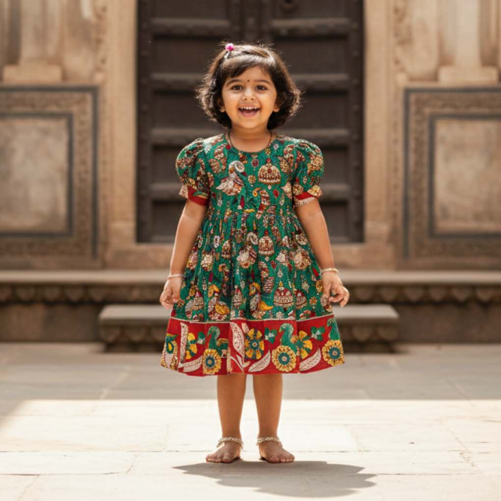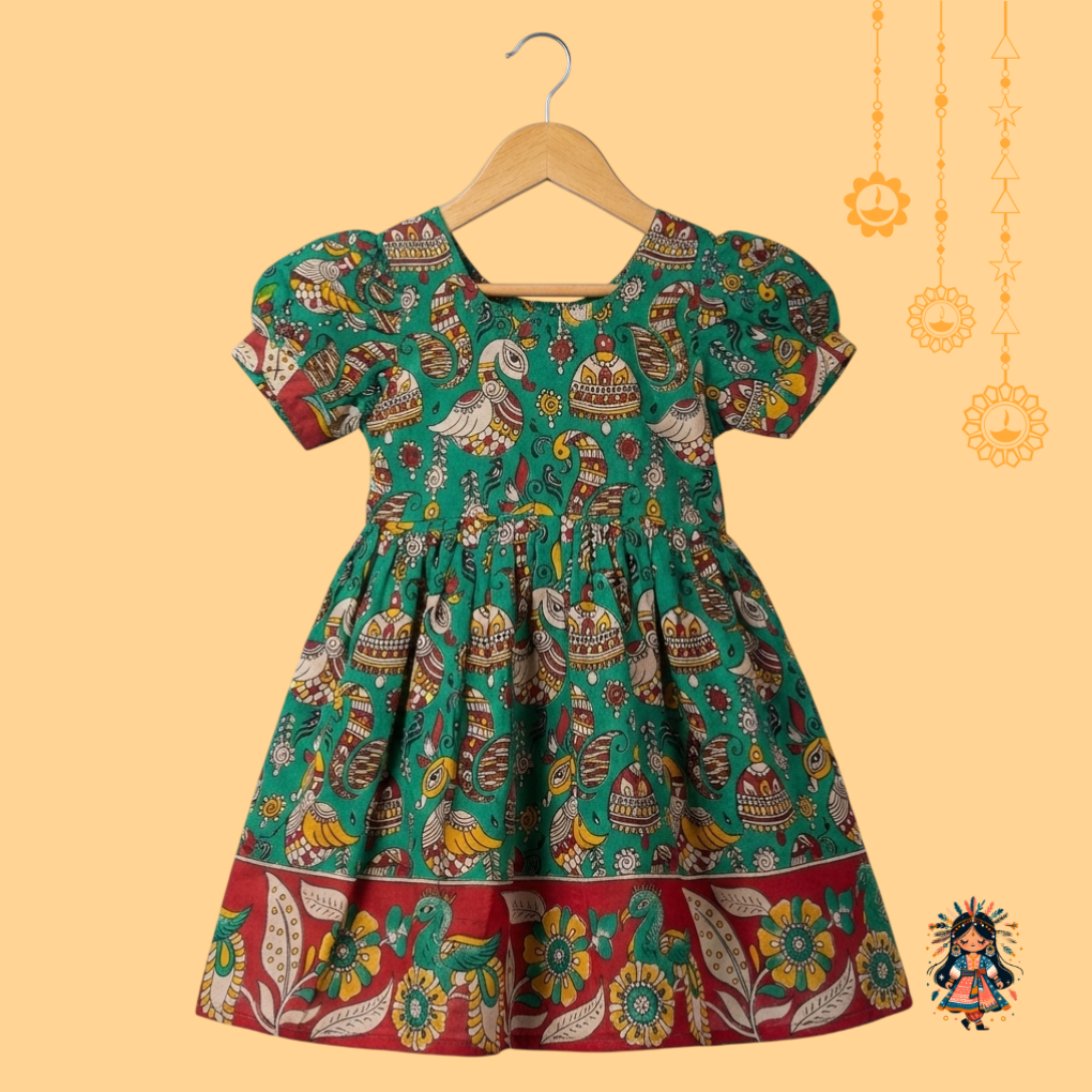 Fabric & Print: The frock features a vibrant Rama base fabric adorned with intricate Kalamkari patterns. The motifs include stylized temple domes, peacocks, and floral designs.