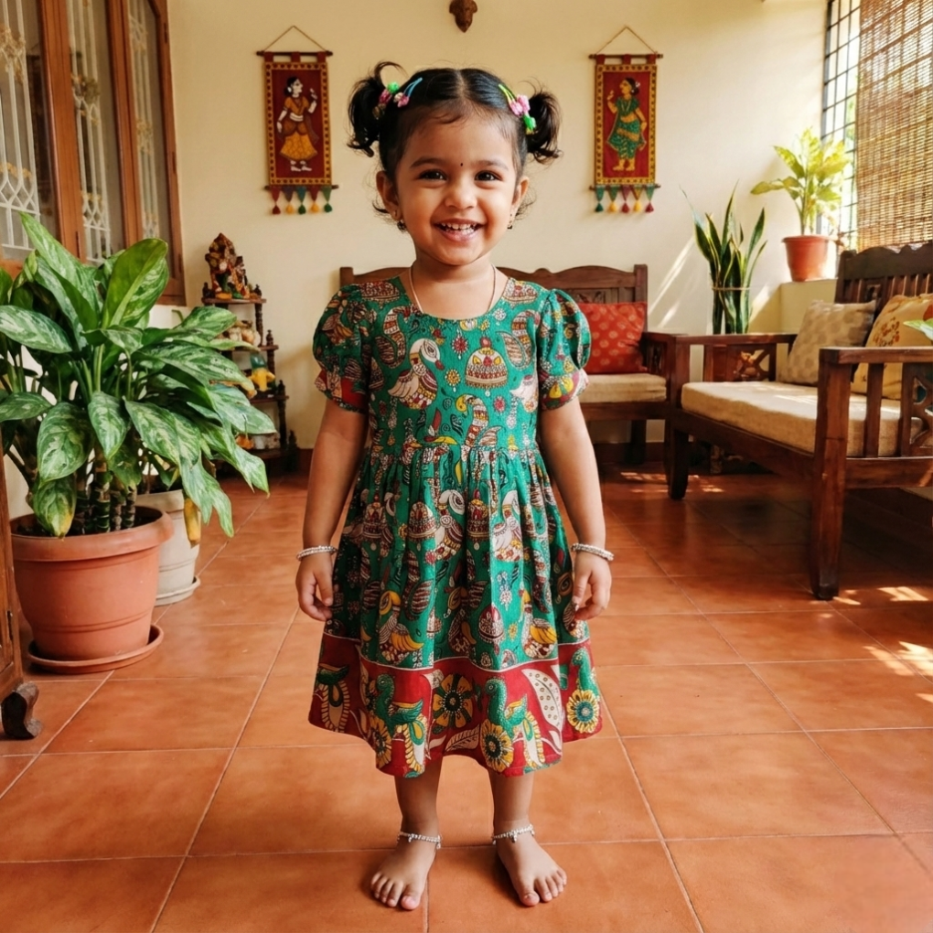 This Frock features a vibrant, traditional-style frock designed for young girls. This charming girls’ festive frock is crafted from screen-printed Kalamkari fabric, featuring a vibrant Rama base fabric adorned with intricate Kalamkari patterns. The motifs include stylized temple domes, peacocks, and floral designs in shades of maroon, white, and black, adding a fresh and festive feel. The prints bring out a rich ethnic and traditional look, making it perfect for festivals, weddings, ceremonies, and cultural events.